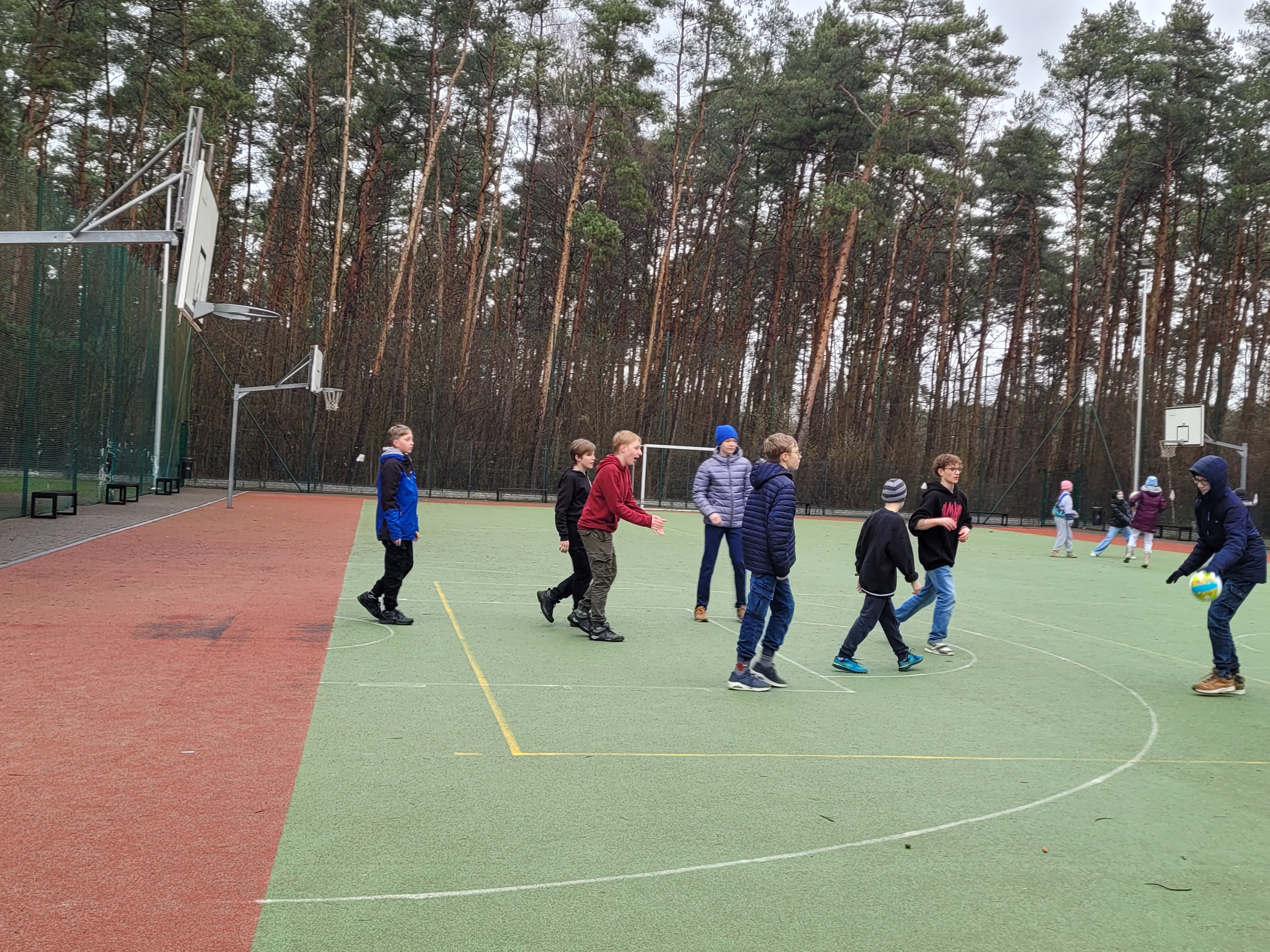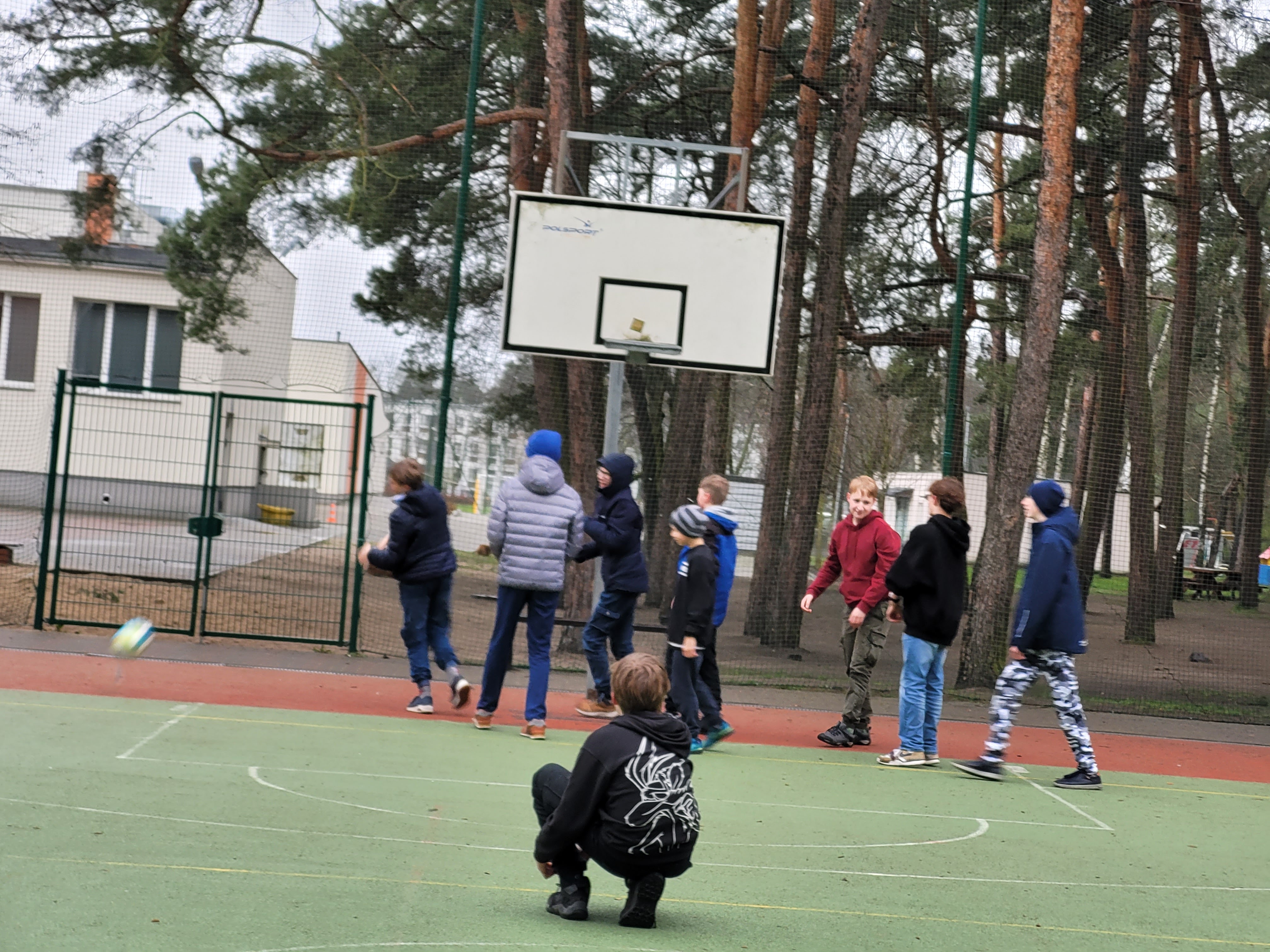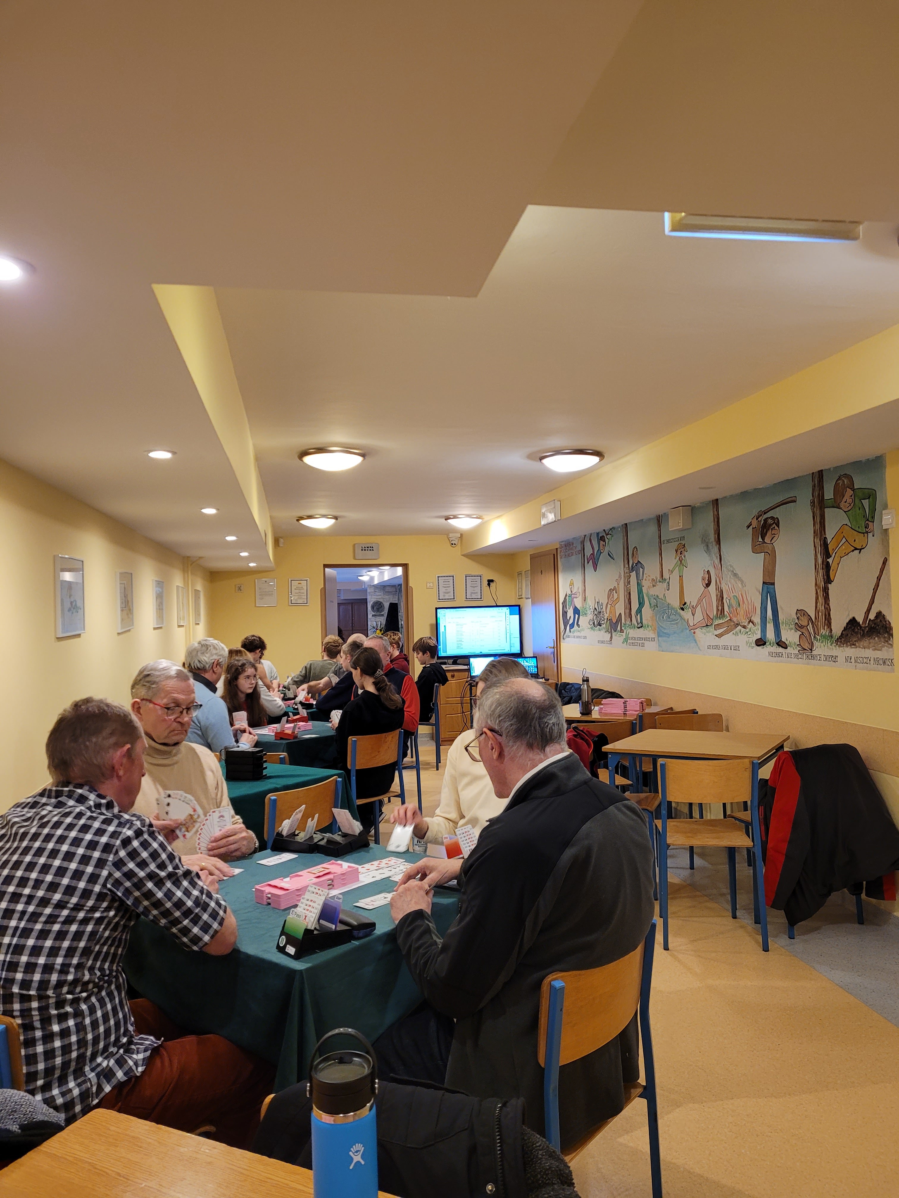 Po turnieju zadbaliśmy o nasze ciała, czyli skonsumowaliśmy pizzę, a następnie uzupełniliśmy zapasy tlenu rozgrywając intensywne zmagania w piłkę. Starsi uczniowie preferowali spacer. Wykorzystaliśmy w ten sposób krótkie okienko pogodowe między kolejnymi atakami deszczu, które szczęśliwie trafiło w nasz poobiedni czas. Zregenerowani usiedliśmy do zielonych stolików, w dwóch grupach szkoleniowych. Bardziej zaawansowani dostali 8 rozdań do rozegrania i odczytania zakamuflowanego w nich motywu szkoleniowego. Najlepiej zadanie wykonali Hubert z Marleną. W większości ocena rozdań była trafna, Ci którzy potrzebowali więcej wskazówek otrzymali je w czasie obszernego omówienia w wykonaniu Ryszarda Paluczka. Grupa początkująca w tym czasie ćwiczyła rozgrywkę na przykładowych rozdaniach z wyznaczonym kontraktem. Jeśli nie udawało się za pierwszym razem, rozgrywkę powtarzano dwukrotnie, w najgorszym razie ze wskazówkami Elżbiety Paluczek, która nadzorowała ćwiczenia. Na koniec został czas na samodzielnie przygotowaną kolację i zajęcia integracyjne w dowolnych zestawieniach towarzyskich, które przeniosły się po 23.00 do swoich pokojów. Mimo nocnej aktywności zajęcia szkoleniowe zaczęły się nazajutrz bardzo punktualnie. Grupę początkujących szkolił dalej Marcin Bonawenturczak, który przyjechał z Poznania, zaś zaawansowani realizowali dalej plan dydaktyczny Elżbiety I Ryszarda Paluczków, który przewidywał grę turniejową na częściowo układanych rozdaniach utrwalających wczorajsze motywy. Zmęczenie trochę dawało się we znaki, ale uratowała nas przerwa z niespodzianką – plackiem maślanym lokalnej firmy cukierniczej pani Hoffman.