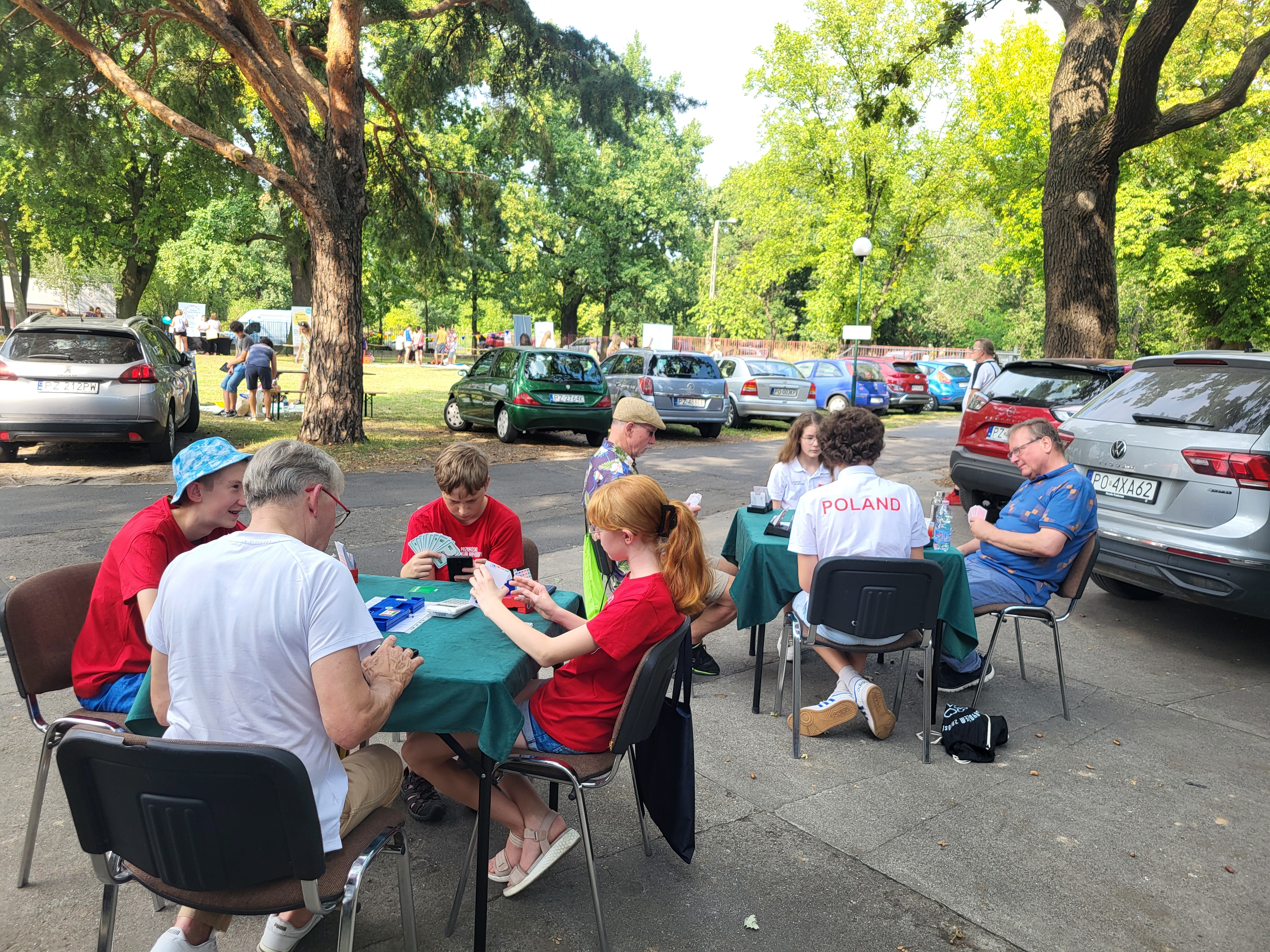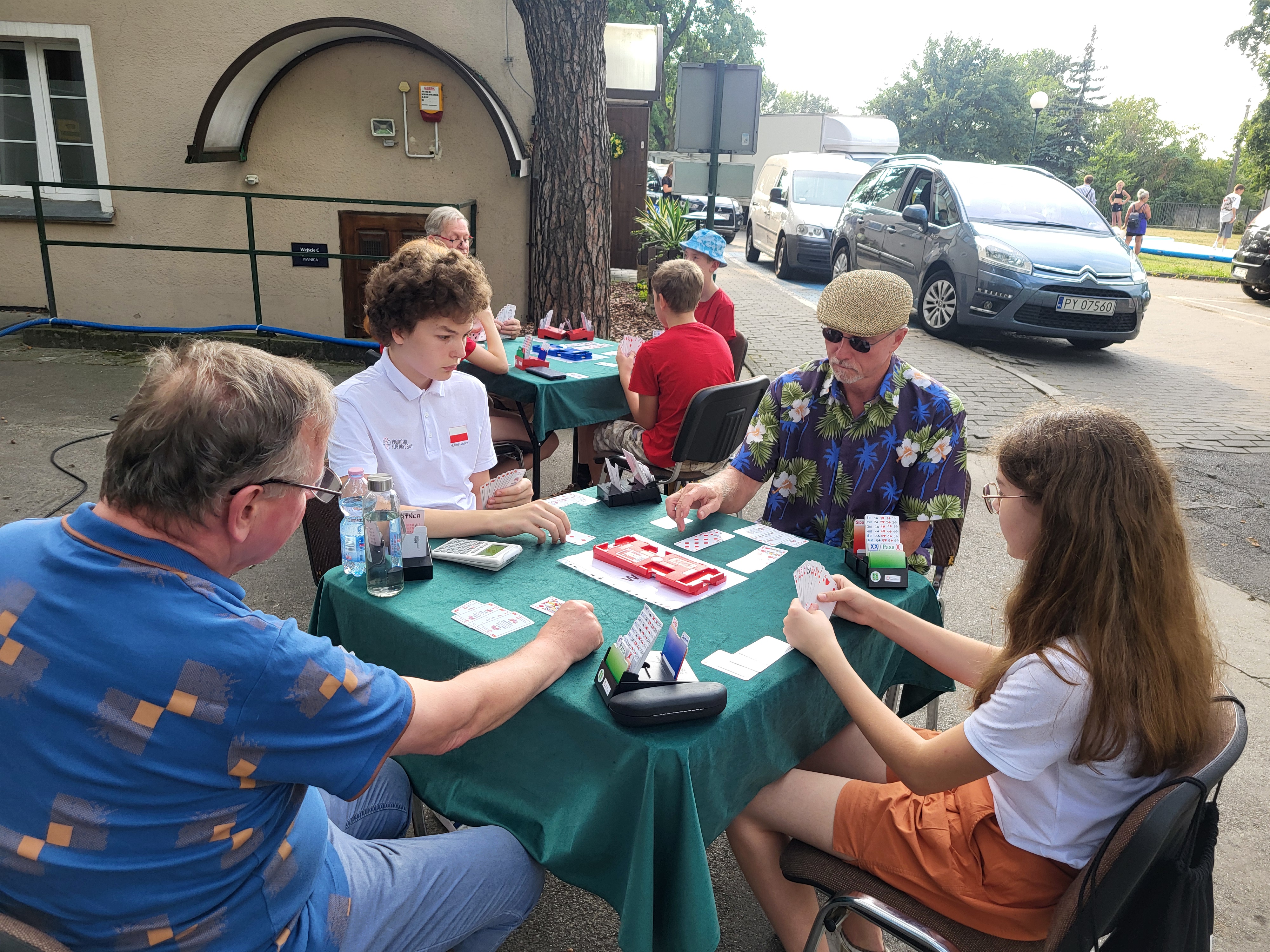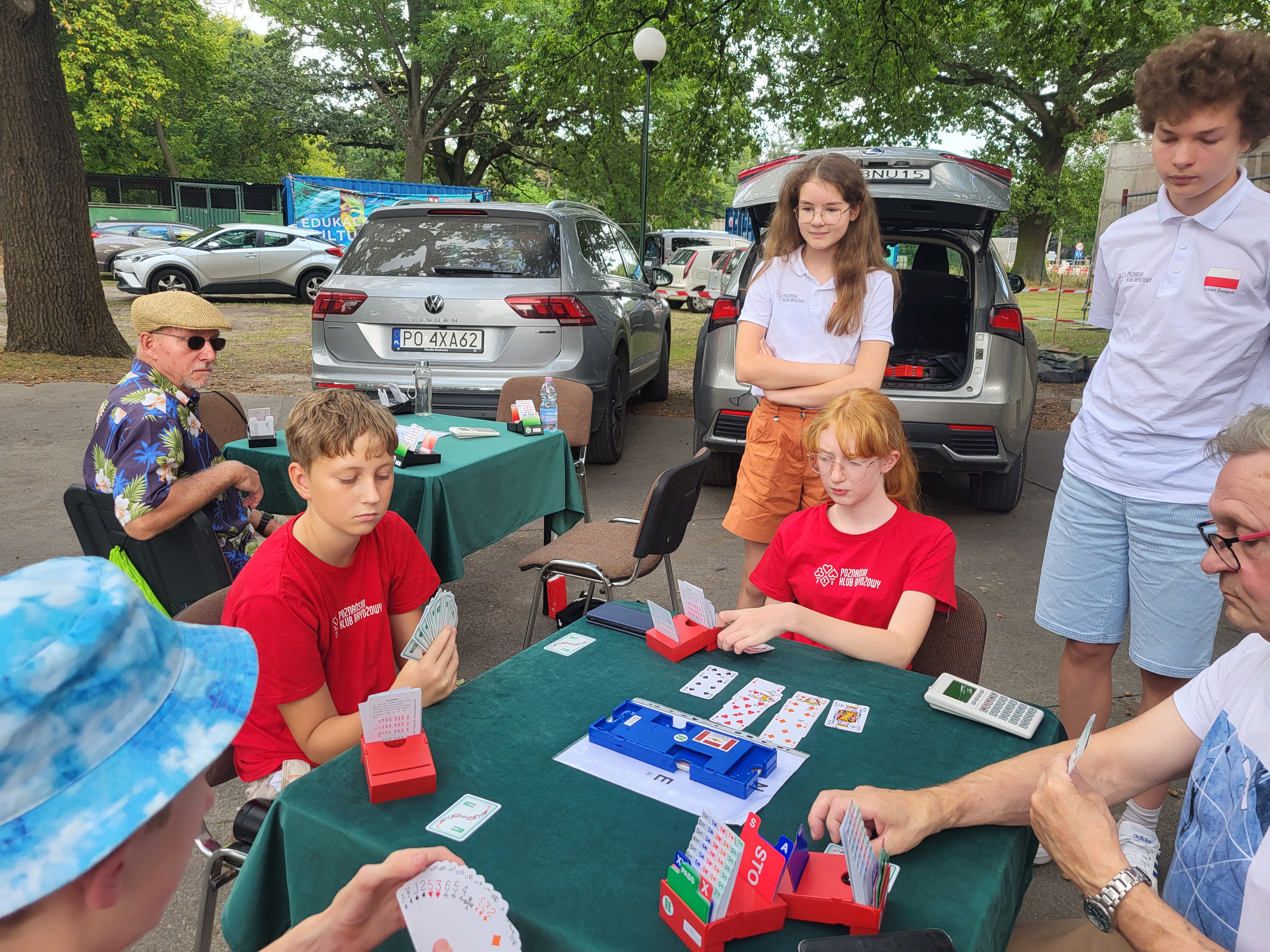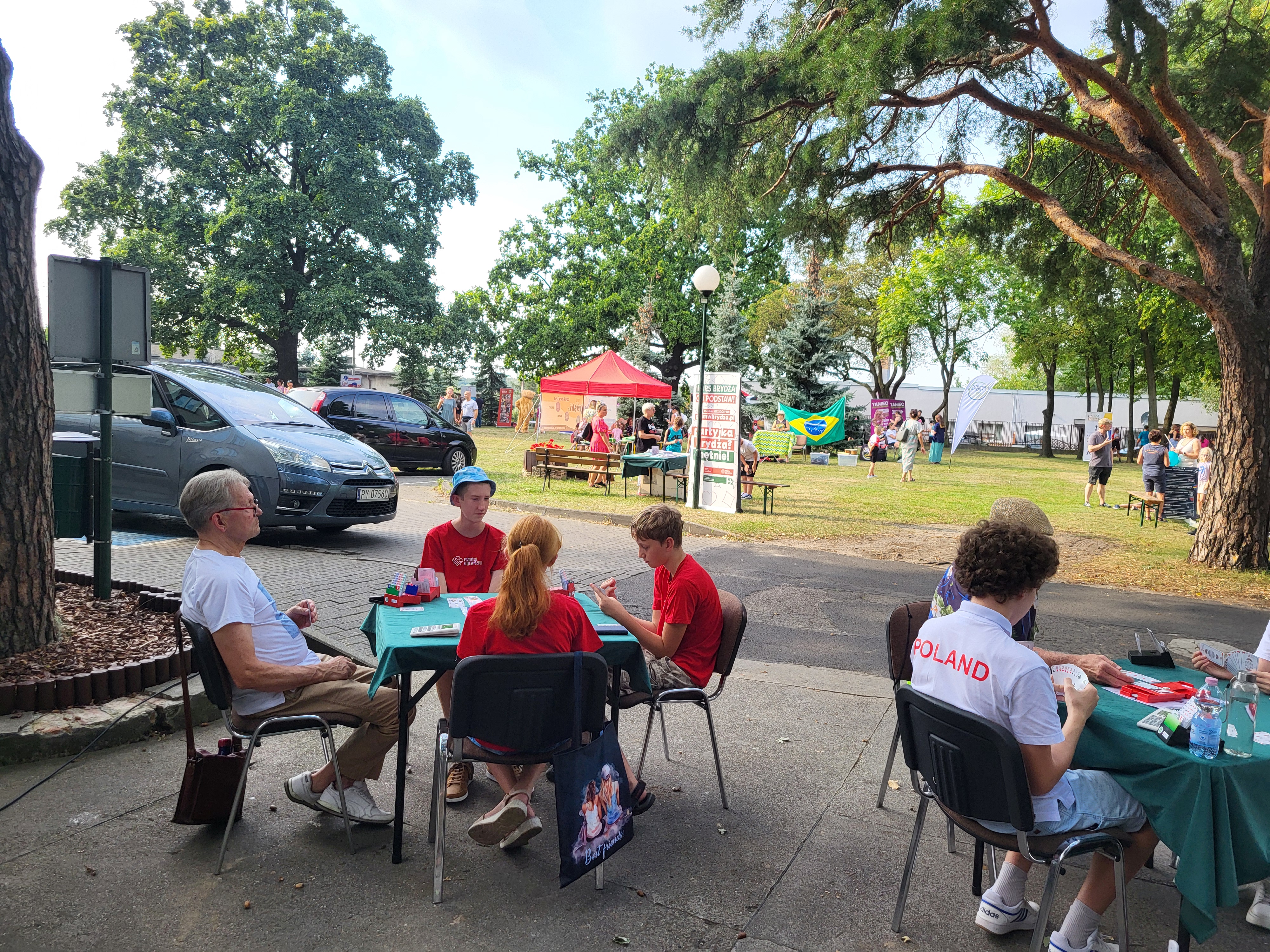 Lato zakończyliśmy z przytupem. Najpierw prezentowaliśmy się na targach zajęć pozalekcyjnych w piątek przed Ośrodkiem Kultury w Swarzędzu. Było 11 osób z klubu, w tym 5 dzieci. Tłumów nie było, to dopiero pierwsza taka impreza w gminie organizowana przez Centrum Usług Społecznych. Tym co przyszli na targi rozdawaliśmy ulotki i cierpliwie tłumaczyliśmy zalety gry w brydża. Mecz seniorzy kontra juniorzy zakończył się zwycięstwem młodszych.