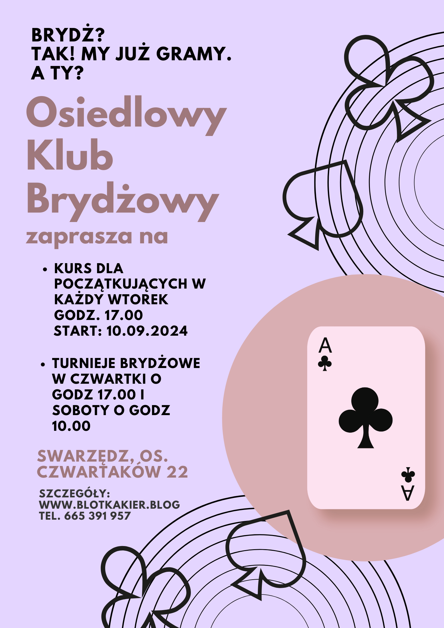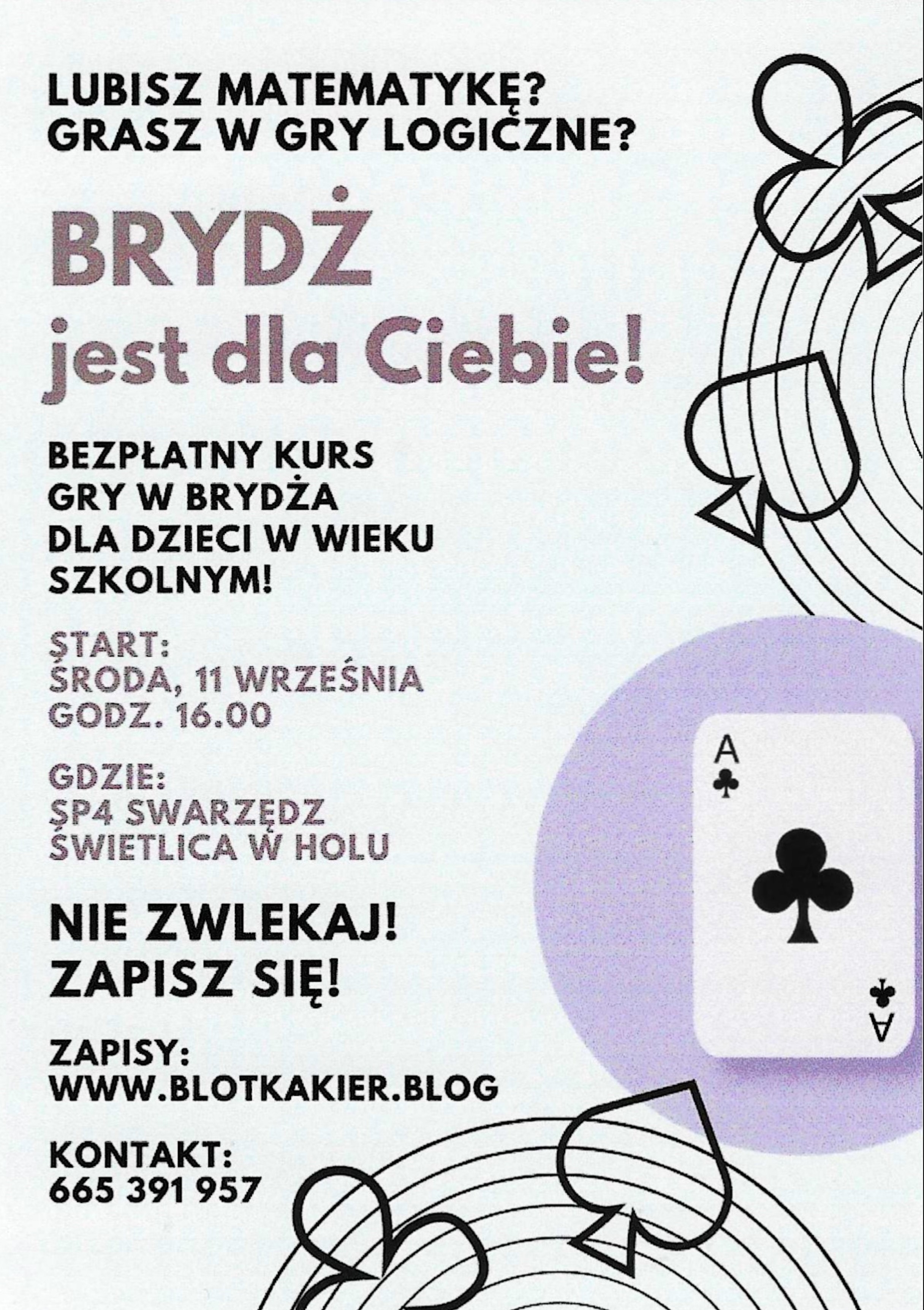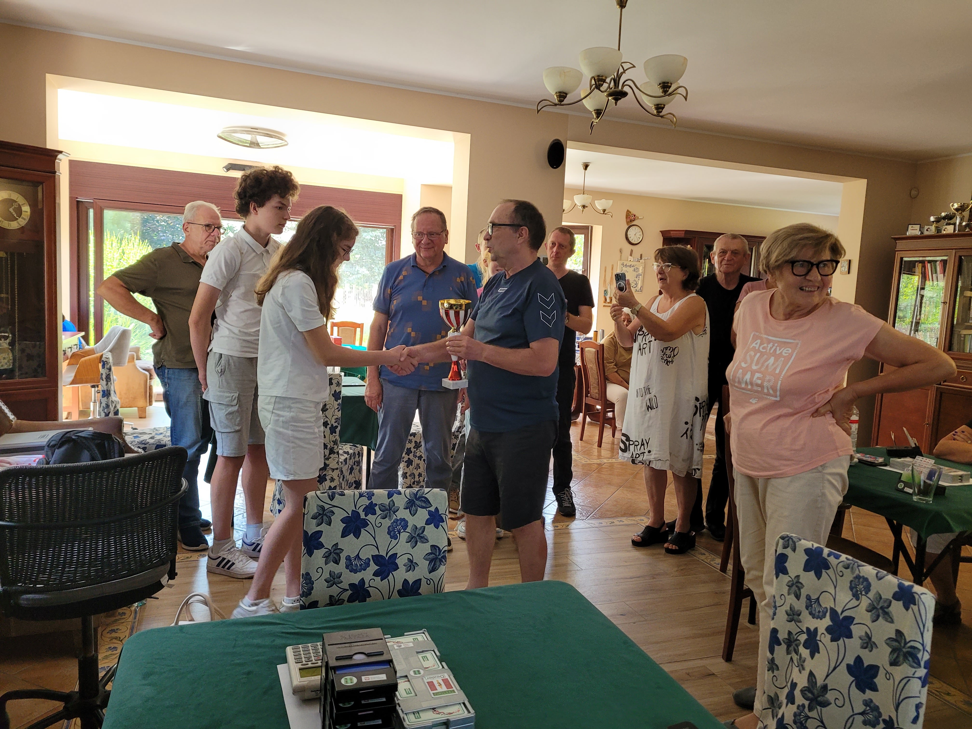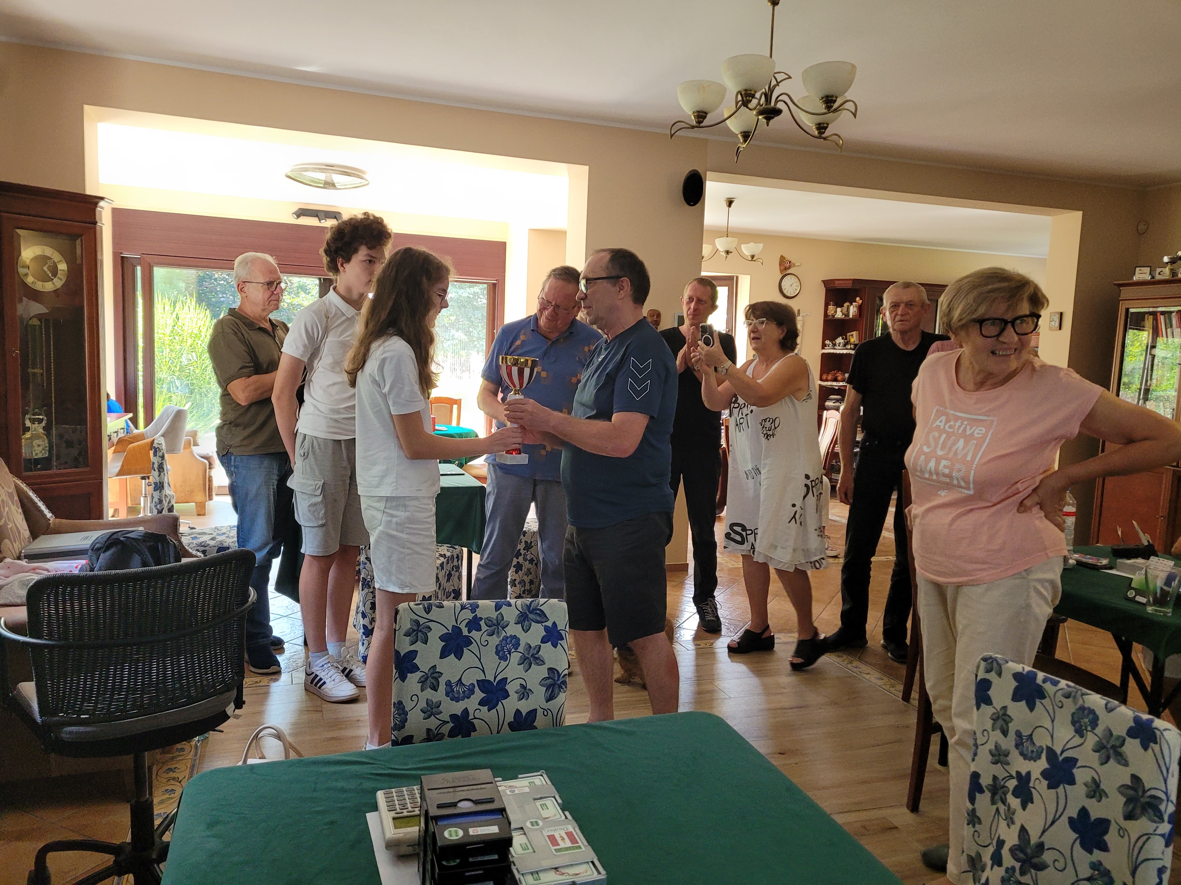 Lato zakończyliśmy z przytupem. Najpierw prezentowaliśmy się na targach zajęć pozalekcyjnych w piątek przed Ośrodkiem Kultury w Swarzędzu. Było 11 osób z klubu, w tym 5 dzieci. Tłumów nie było, to dopiero pierwsza taka impreza w gminie organizowana przez Centrum Usług Społecznych. Tym co przyszli na targi rozdawaliśmy ulotki i cierpliwie tłumaczyliśmy zalety gry w brydża. Mecz seniorzy kontra juniorzy zakończył się zwycięstwem młodszych.