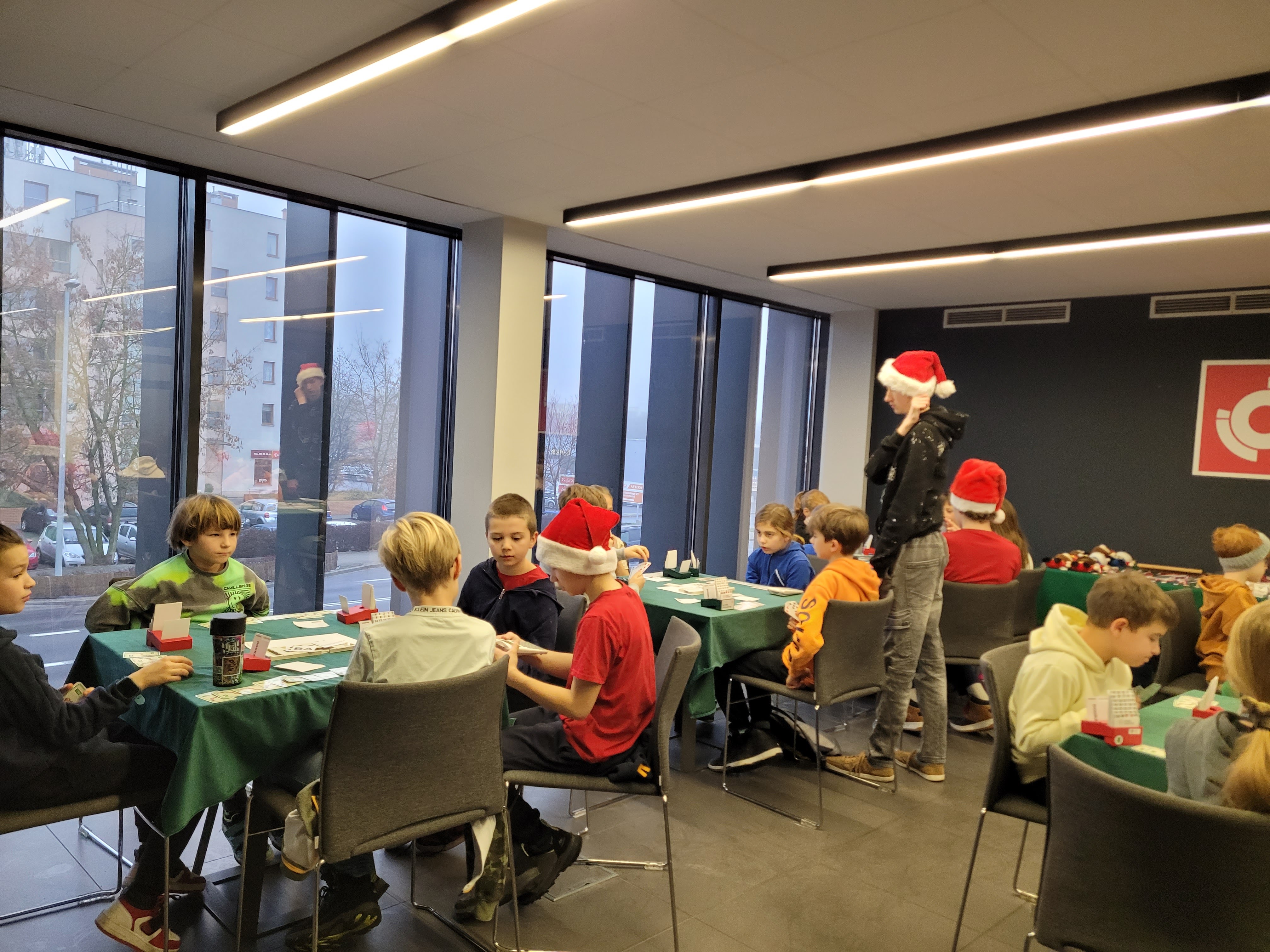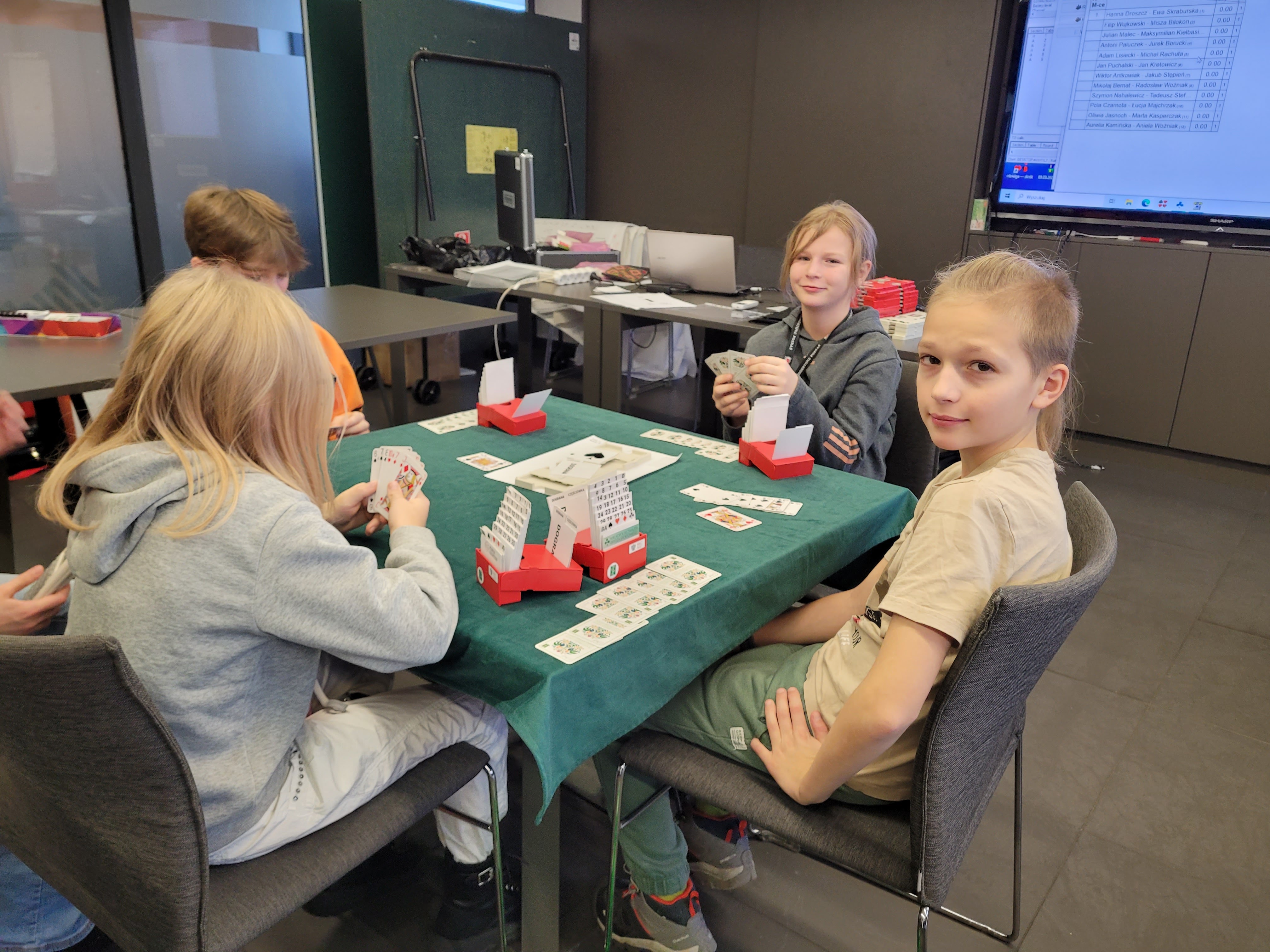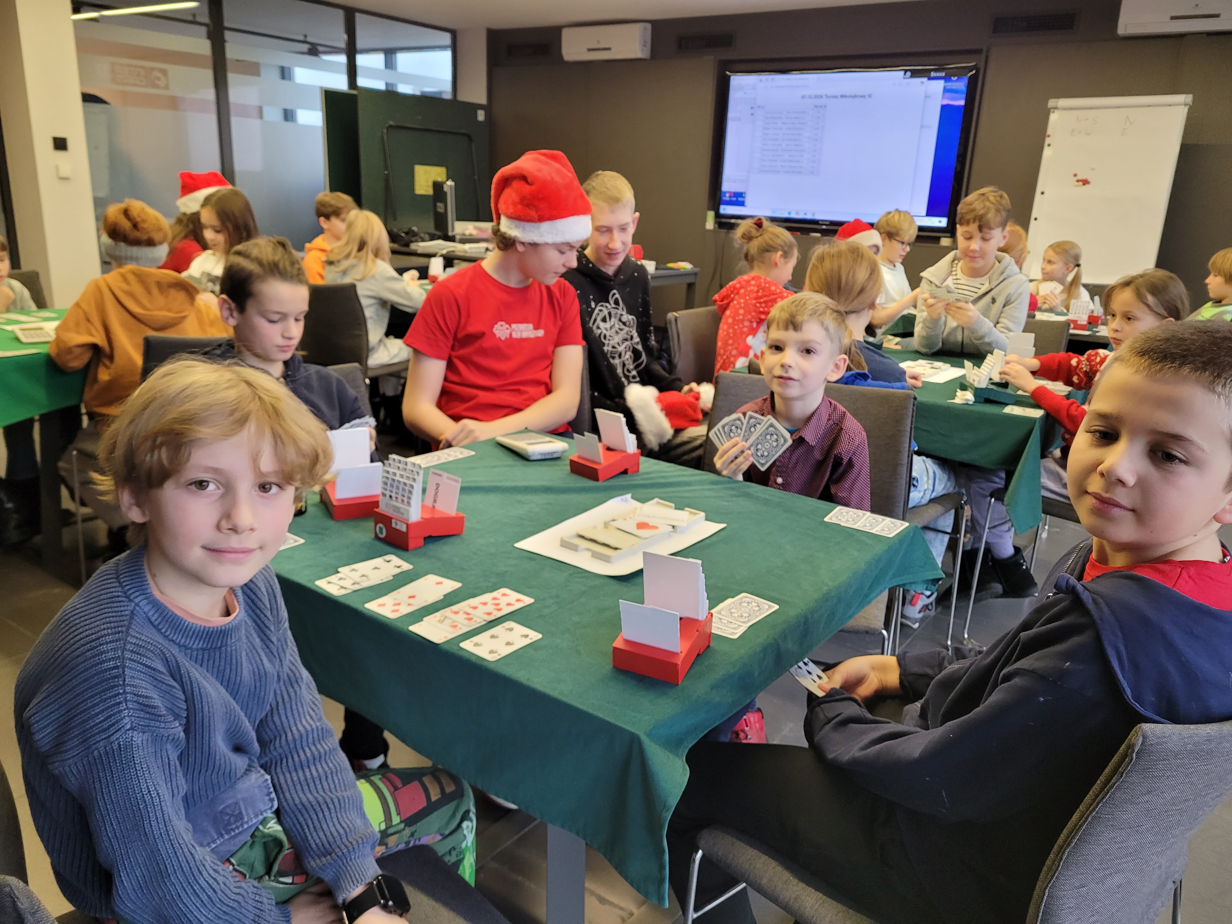 W sobotę 7.12.2024 w sali szkoleniowej Inter Cars odbył sie turniej minibrydża dla najmłodszych. Dzieci to uczniowie szkół podstawowych ze Swarzędza i Kobylnicy z klas II-VI. Zagrało 24 zawodników, które zaczęły swoją przygodę z brydżem we wrześniu tego roku. Najtrudniej było podjąć decyzję, czy grać kolor, czy bez atu oraz czy zaryzykować dograną, czy też pozostać na częściówce. Skład czołówki zmieniał się jak w kalejdoskopie, by ostatecznie wyłonić dwie pary złotych medalistów: Tadeusz Stefański i Szymon Nahalewicz z kl III oraz Łucja Majchrzak z Polą Czarnotą z kl IV oraz parę brązowych medalistek: Hanię Droszcz i Ewę Skraburską z kl IV. Wszystkie dzieci zostały nagrodzone, bo też zasłużyły sobie rozegraniem 8 rozdań w czasie 3 godzin z przerwą na poczęstunek. W tym miejscu szczególne podziękowania należą się Mamie Mikołaja, która upiekła pierniczki . Dziękujemy też młodzieży z 2 letnim stażem brydżowym, którzy pilnowali, aby dzieci trzymały się zasad gry i pomagały przy wpisuwaniu wyników rozdania.