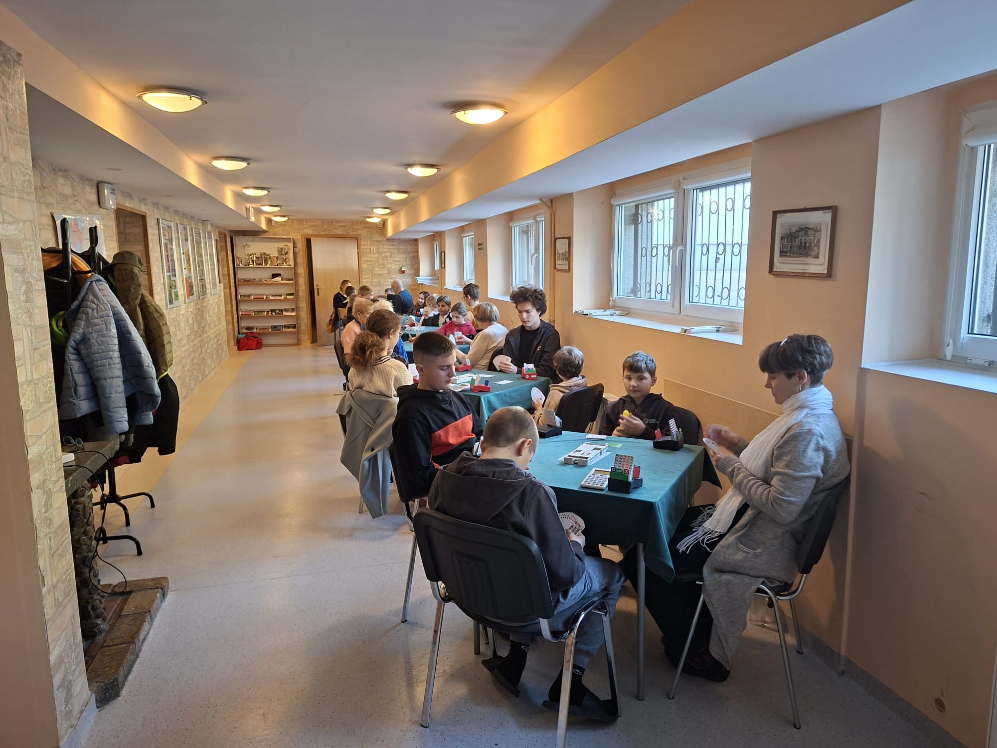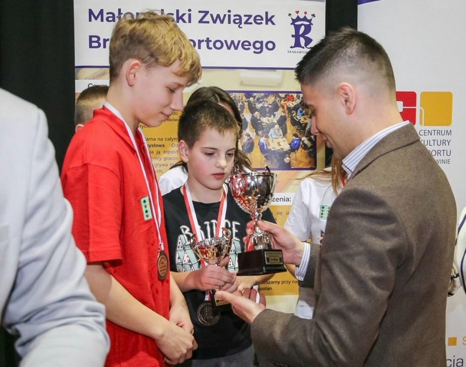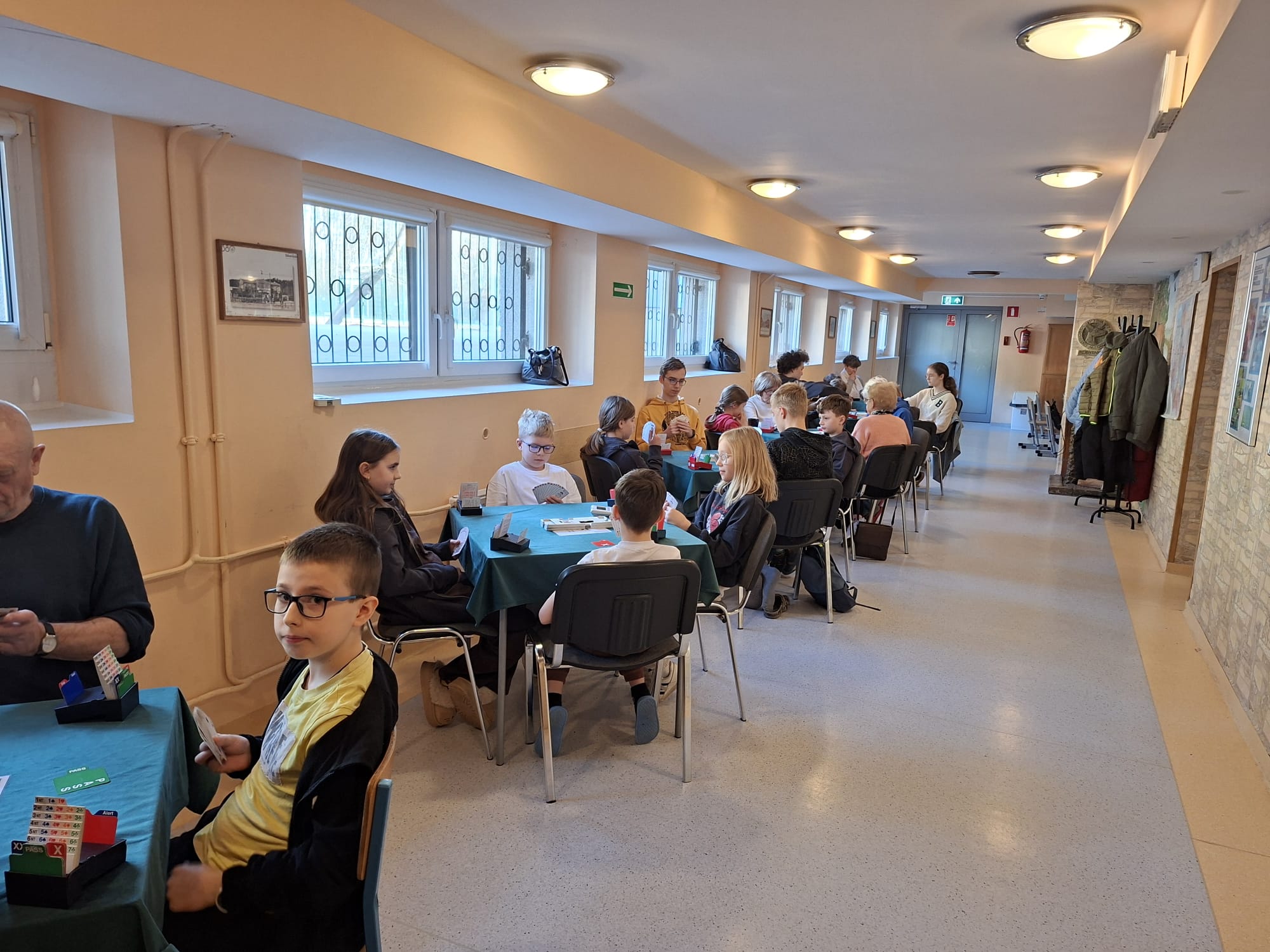 W sobotę zorganizowaliśmy szkolenia w dwóch grupach: początkującej i średnio zaawansowanej. Młodsi przy pomocy układanki utrwalali odpowiedzi na 1 ba, a później ćwiczyli to w praktyce, jednocześnie trenując zastosowanie impasu, ekspasu i przepuszczenia w celu zrealizowania kontraktu. Obrońcy dostali podstawowe instrukcje dotyczące wistu. W czasie przerwy mogli studiować brydżowe przysłowia, które mają utrwalać dobre nawyki na tym podstawowym poziomie. Dopiero później dowiedzą się, jak rozpoznawać sytuacje, w których trzeba będzie od nich odchodzić. Grupa średnio zaawansowana utrwalała konwencję magistra, odwrotkę i cue-bidy. Wszyscy mogli się zmierzyć w turnieju wieczornym oraz w niedzielnym, w którym oprócz dzieci wzięła także udział młodzież i dorośli.