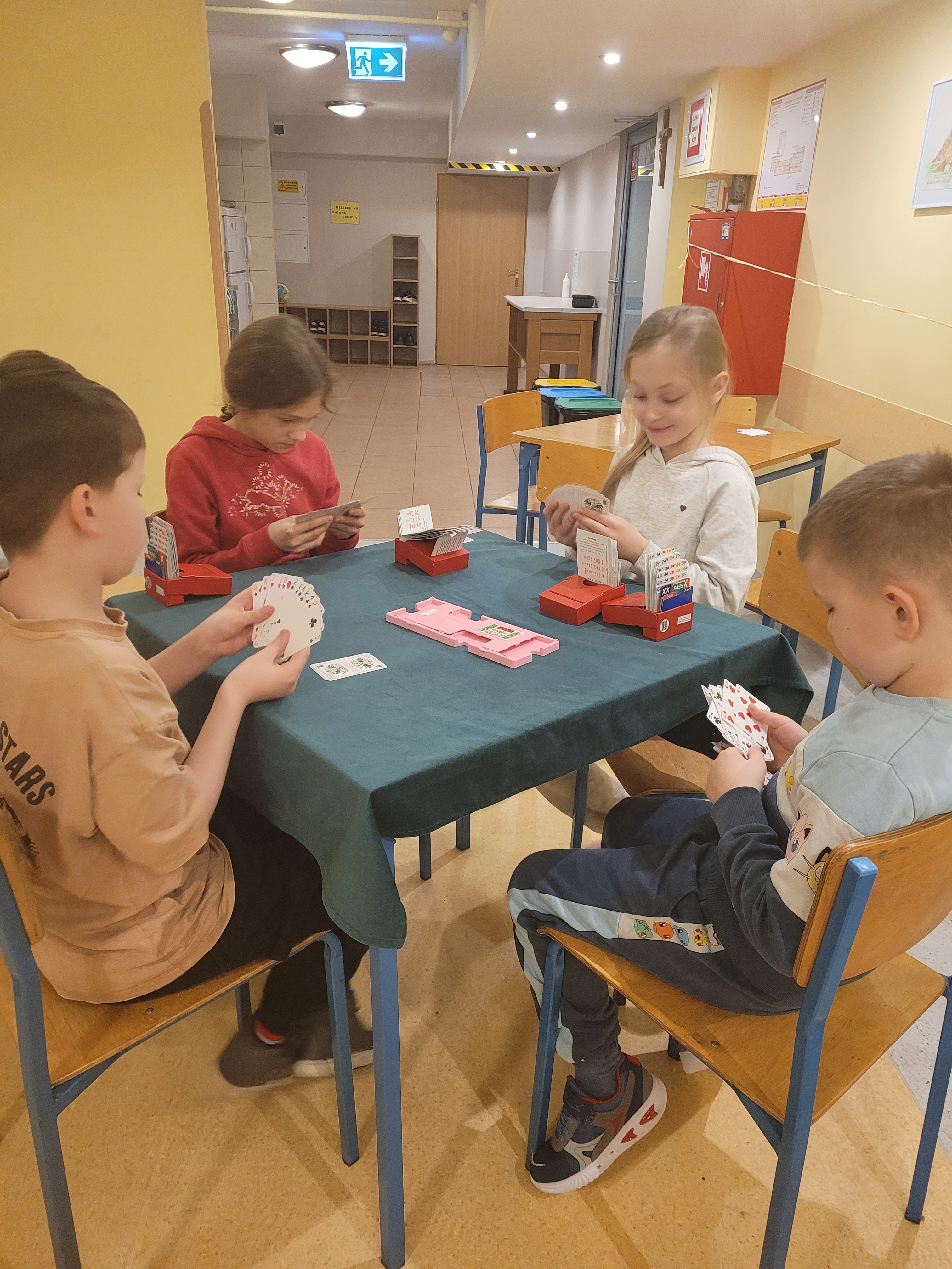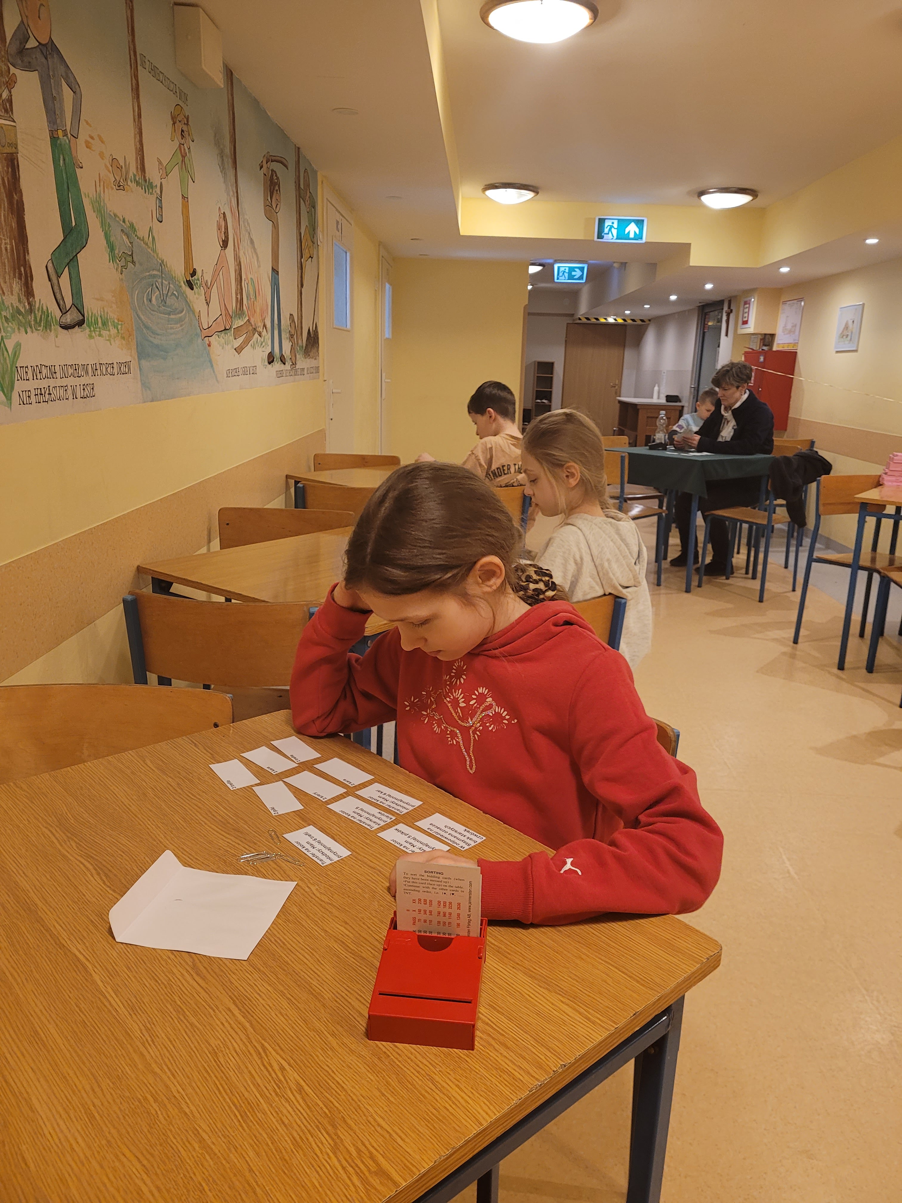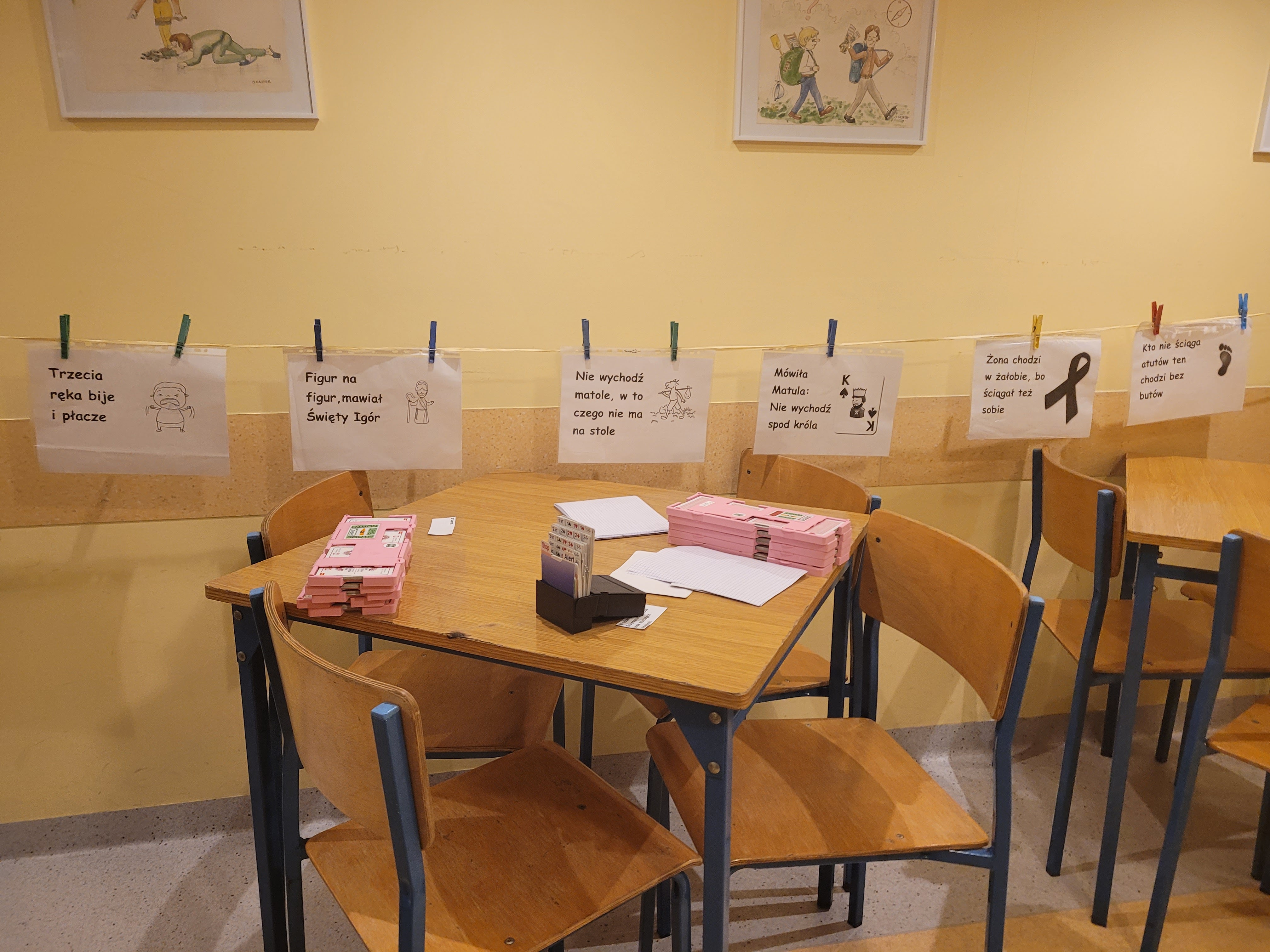 W sobotę zorganizowaliśmy szkolenia w dwóch grupach: początkującej i średnio zaawansowanej. Młodsi przy pomocy układanki utrwalali odpowiedzi na 1 ba, a później ćwiczyli to w praktyce, jednocześnie trenując zastosowanie impasu, ekspasu i przepuszczenia w celu zrealizowania kontraktu. Obrońcy dostali podstawowe instrukcje dotyczące wistu. W czasie przerwy mogli studiować brydżowe przysłowia, które mają utrwalać dobre nawyki na tym podstawowym poziomie. Dopiero później dowiedzą się, jak rozpoznawać sytuacje, w których trzeba będzie od nich odchodzić. Grupa średnio zaawansowana utrwalała konwencję magistra, odwrotkę i cue-bidy. Wszyscy mogli się zmierzyć w turnieju wieczornym oraz w niedzielnym, w którym oprócz dzieci wzięła także udział młodzież i dorośli.